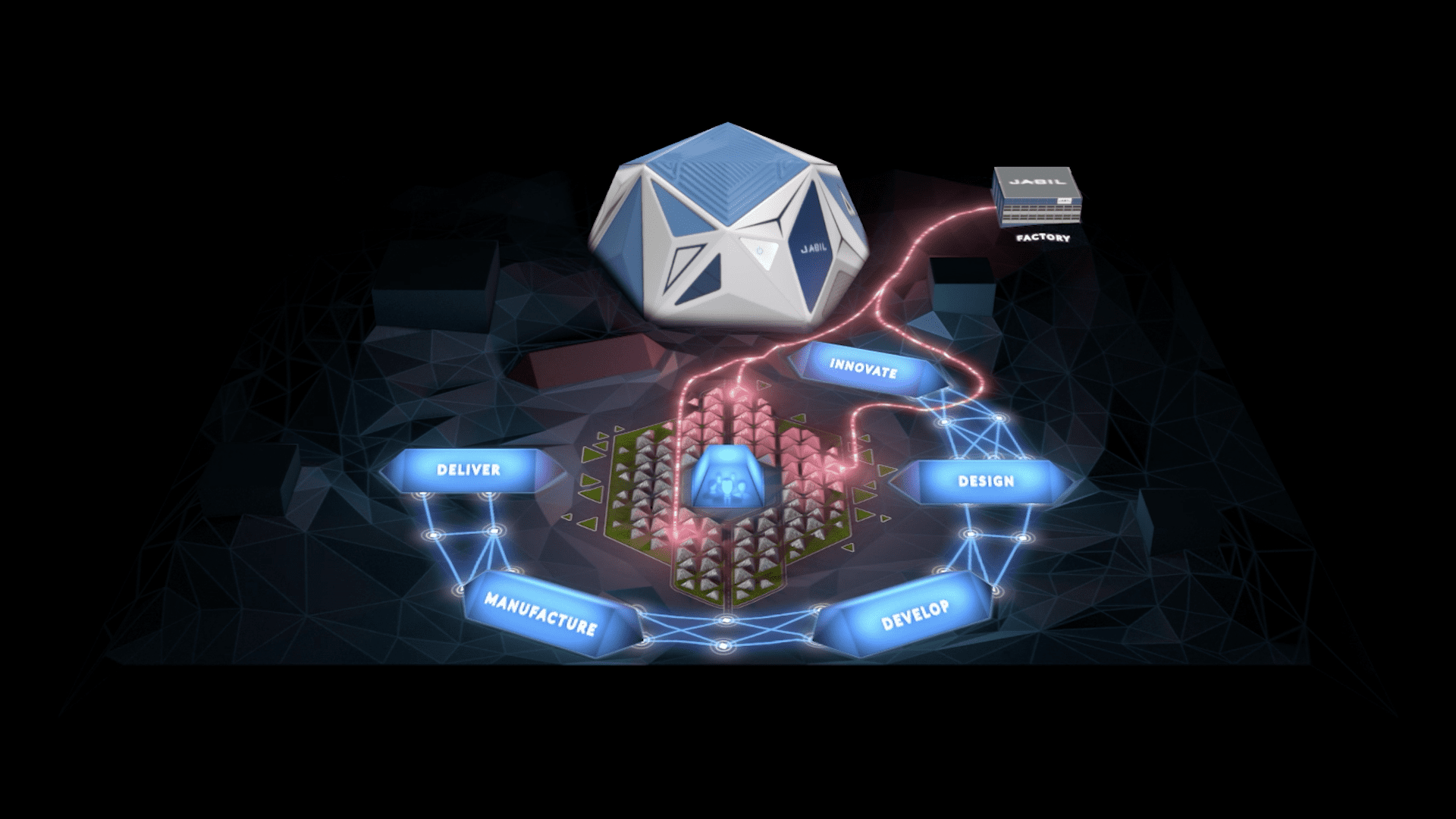 Using 3D printed geometric surfaces plus projected content, the installation was conceived as an in-the-round “digital twin” of Jabil’s process that simulated its end-to-end services, from planning through final product manufacturing.
